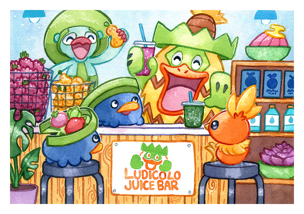 A big print featuring watercolor artwork of Ludicolo, Lotad, Lombre and Torchic enjoying freshly squeezed juice.