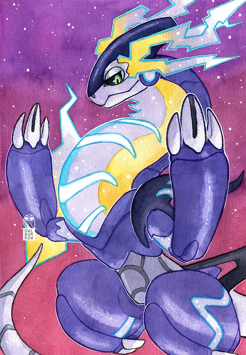 A big watercolor print of Miraidon in front of a smoldering magenta sunset!