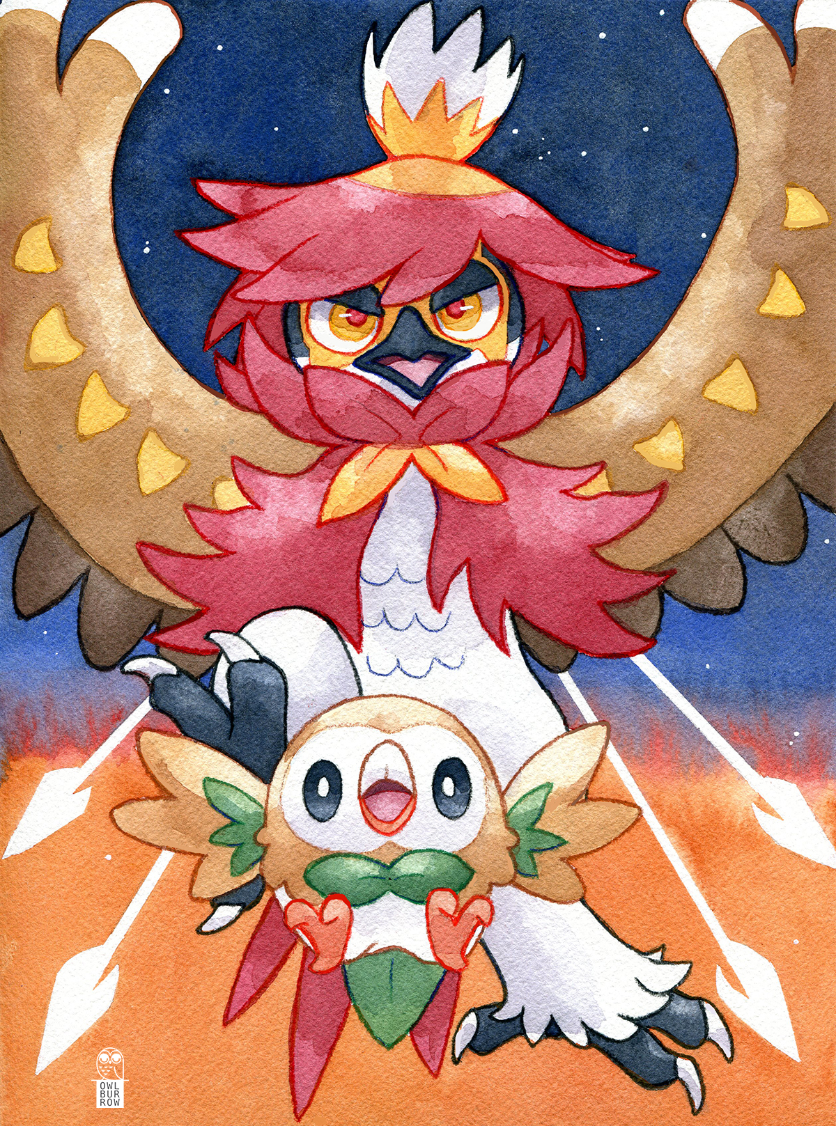 A small watercolor print of Hisuian Decidueye and Rowlet, using their signature move Triple Kick!