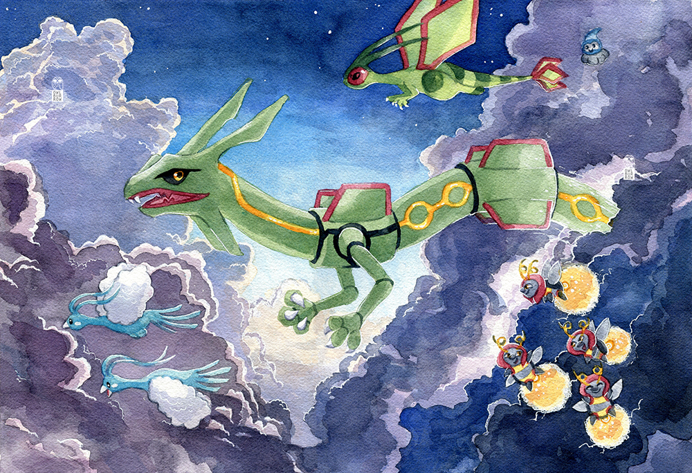 A big watercolor print of the lord of the skies Rayquaza, soaring through the clouds with his flying friends.