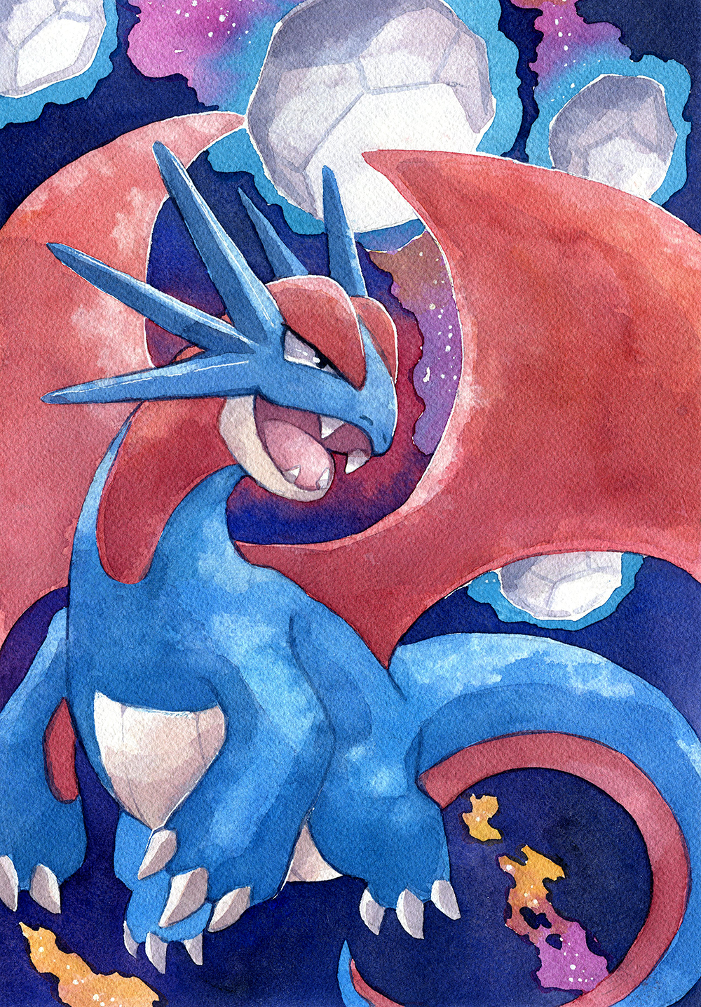 A watercolor print of the proud Dragon type Salamence calling down a Draco Meteor attack from the sky.