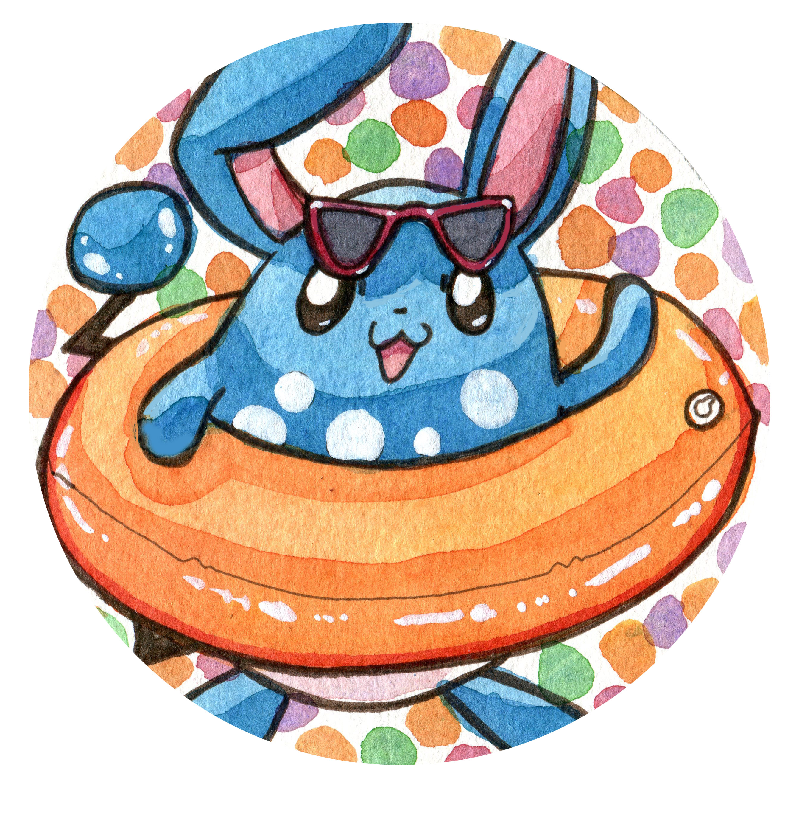 A big 2.5 inch button featuring watercolor artwork of Azumarill, dressed for summer fun! A pin on the back lets you show off your style on your backpack, jacket and more.