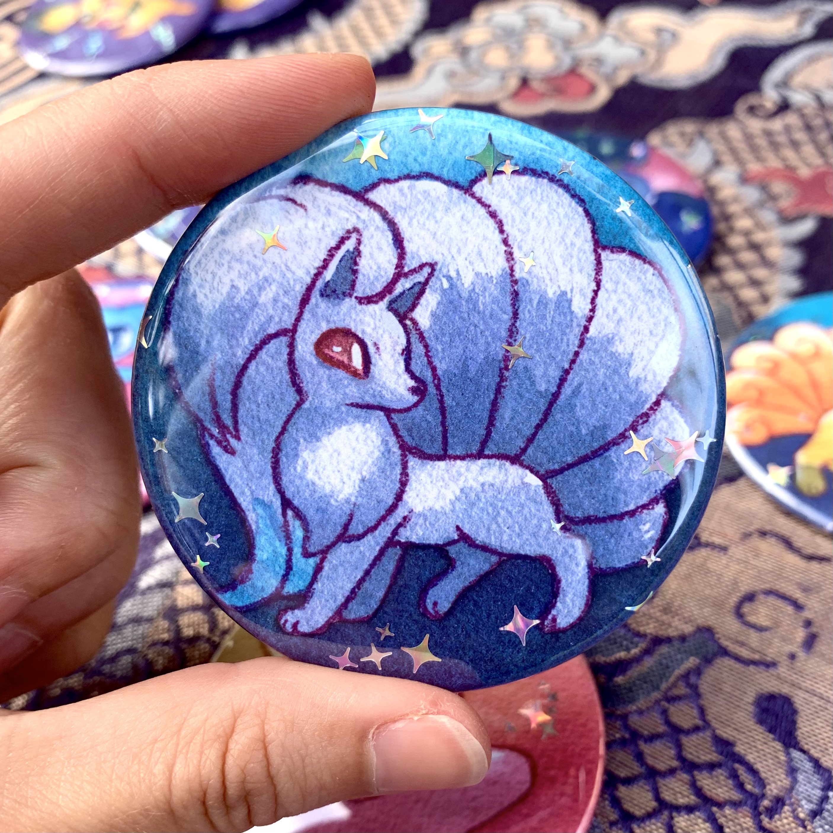 A sparkly, glittery big 2.5 inch button featuring watercolor artwork of Ninetales in its shiny form! A pin on the back lets you show off your style on your backpack, jacket and more.