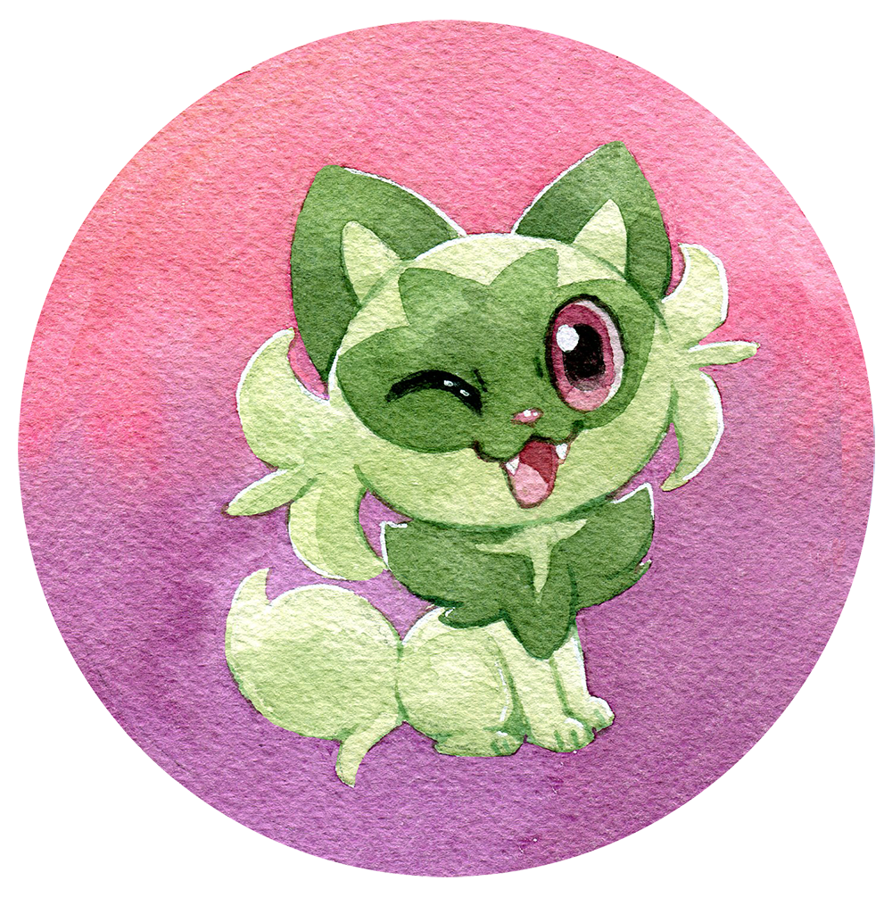 A big 2.5 inch button featuring watercolor artwork of Sprigatito! A pin on the back lets you show off your style on your backpack, jacket and more.