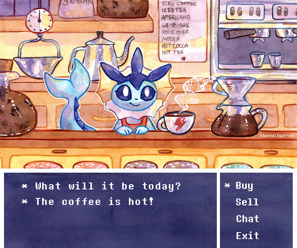 A big print featuring shopkeeper Vaporeon. She's about to serve up a delicious cup of coffee!
