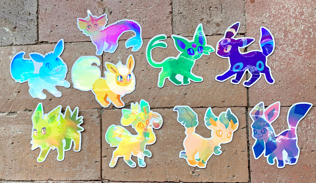 The full set of shiny Eeveelutions, featured on holographic rainbow stickers! Each sticker measures between 3 - 4 inches in size.