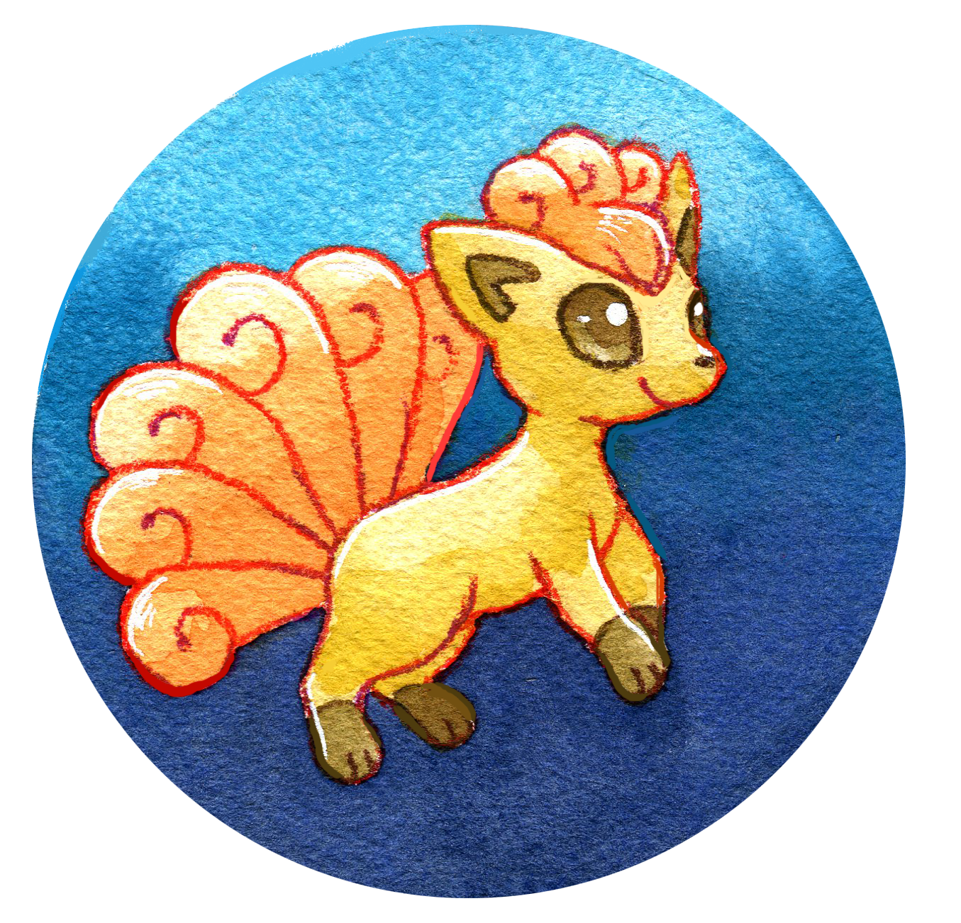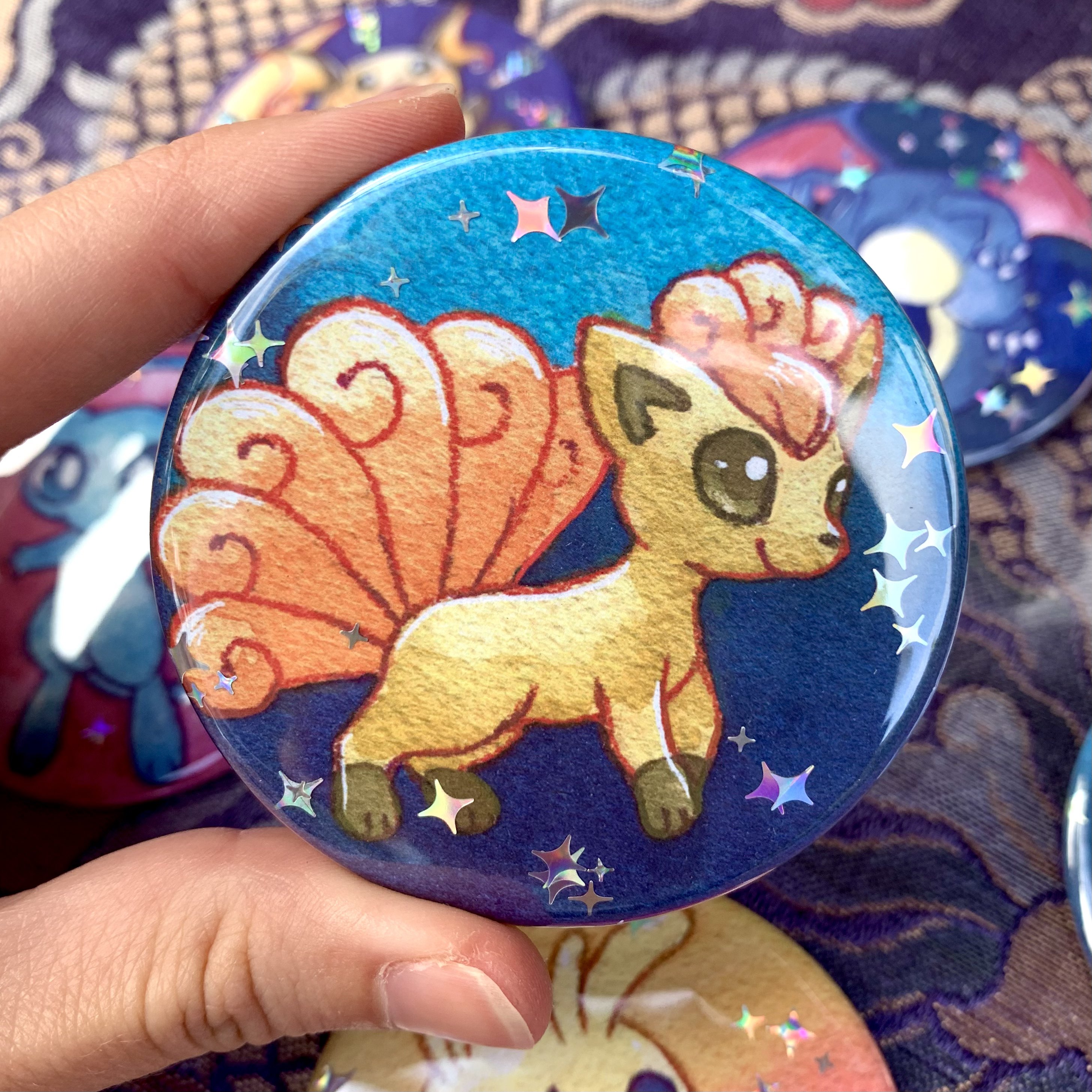 A sparkly, glittery big 2.5 inch button featuring watercolor artwork of Vulpix in its shiny form! A pin on the back lets you show off your style on your backpack, jacket and more.