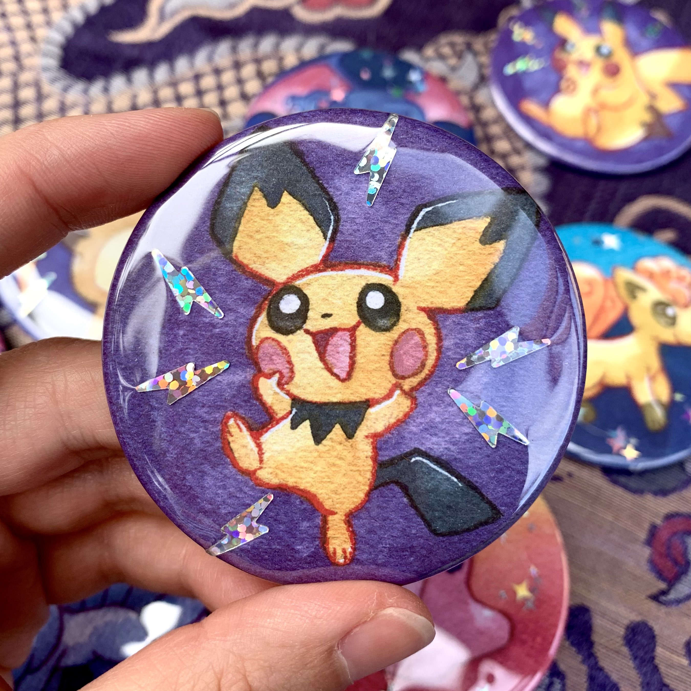 A sparkly, glittery big 2.5 inch button featuring watercolor artwork of Pichu! A pin on the back lets you show off your style on your backpack, jacket and more.