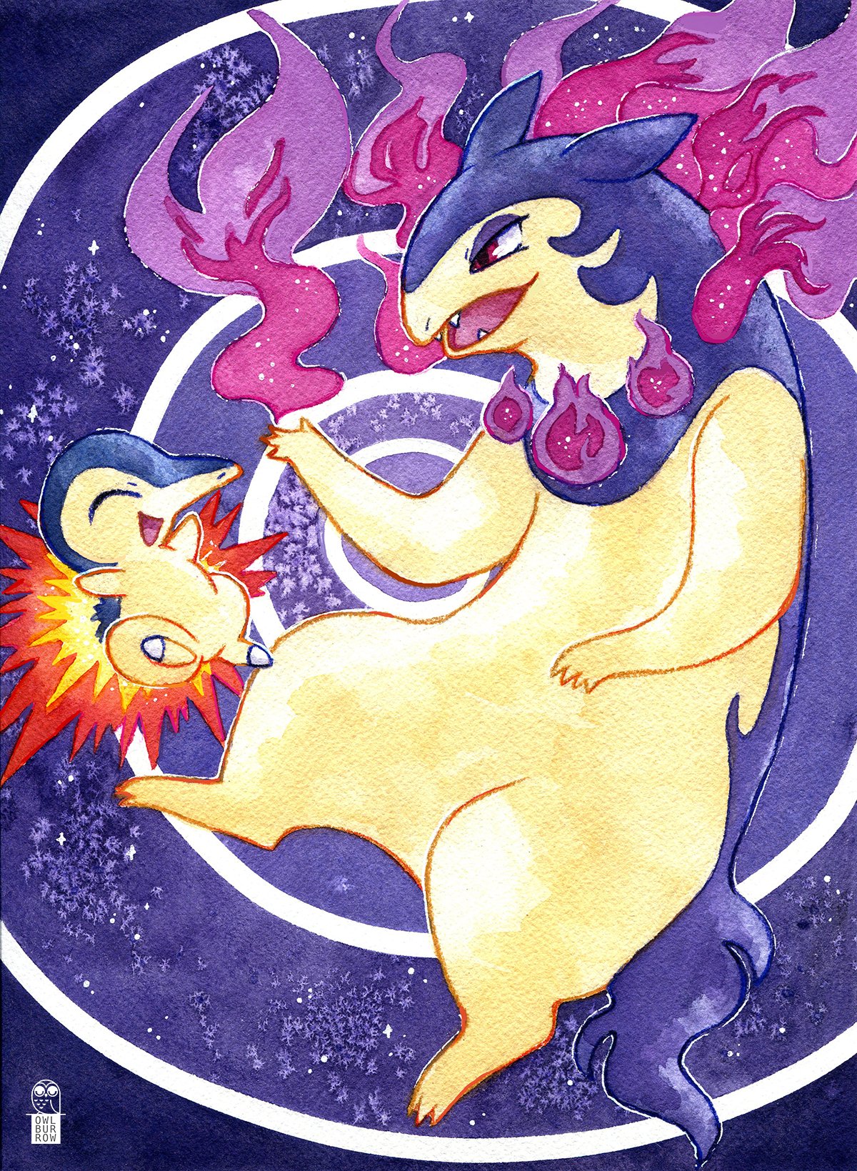 A small watercolor print of Hisuian Typhlosion and Cyndaquil, using their signature move Infernal Parade!