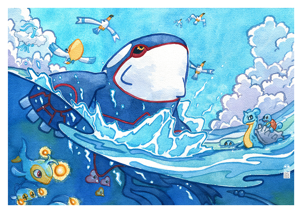 A big watercolor print of the lord of the seas Kyogre as it makes a huge splash in the tropical sun!