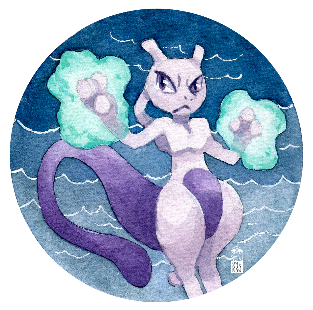 A big 2.5 inch button featuring watercolor artwork of Mewtwo! A pin on the back lets you show off your style on your backpack, jacket and more.