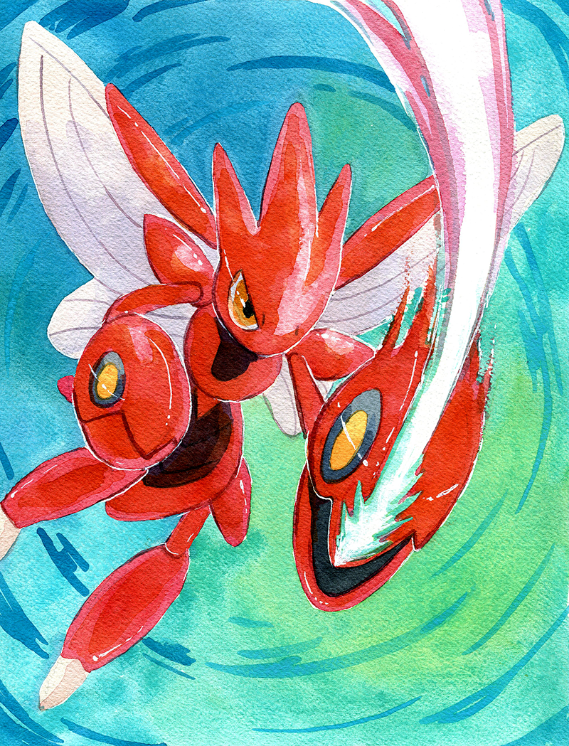 A watercolor print of the fierce Bug and Steel type Scizor, leaping into battle with a Slash attack!