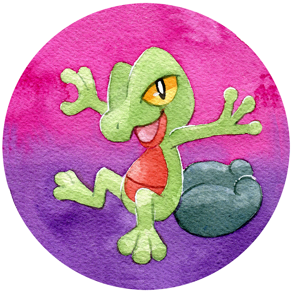 A big 2.5 inch button featuring watercolor artwork of Treecko! A pin on the back lets you show off your style on your backpack, jacket and more.