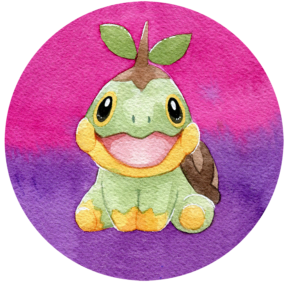 A big 2.5 inch button featuring watercolor artwork of Turtwig! A pin on the back lets you show off your style on your backpack, jacket and more.