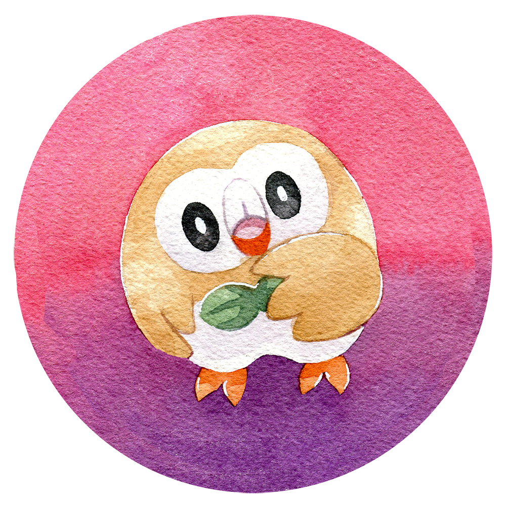 A big 2.5 inch button featuring watercolor artwork of Rowlet! A pin on the back lets you show off your style on your backpack, jacket and more.