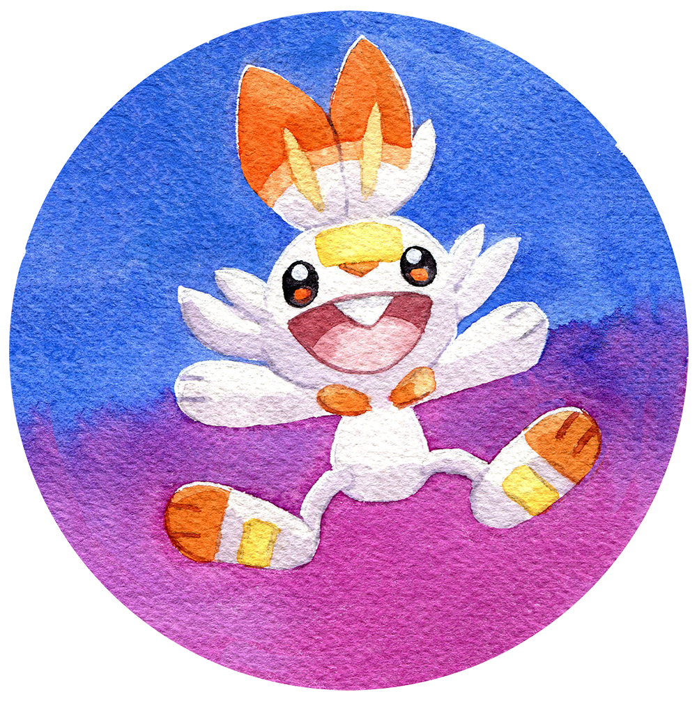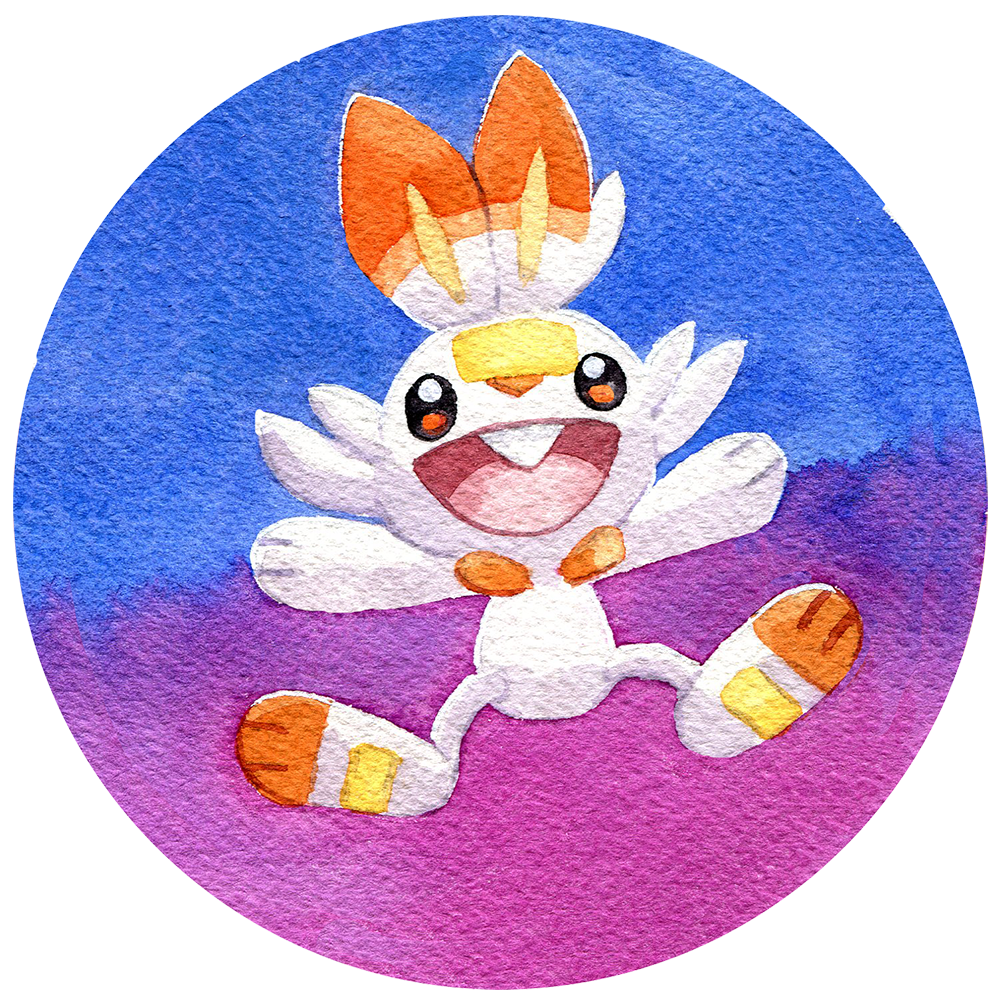 A big 2.5 inch button featuring watercolor artwork of Scorbunny! A pin on the back lets you show off your style on your backpack, jacket and more.