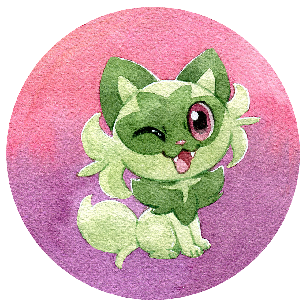 A big 2.5 inch button featuring watercolor artwork of Sprigatito! A pin on the back lets you show off your style on your backpack, jacket and more.