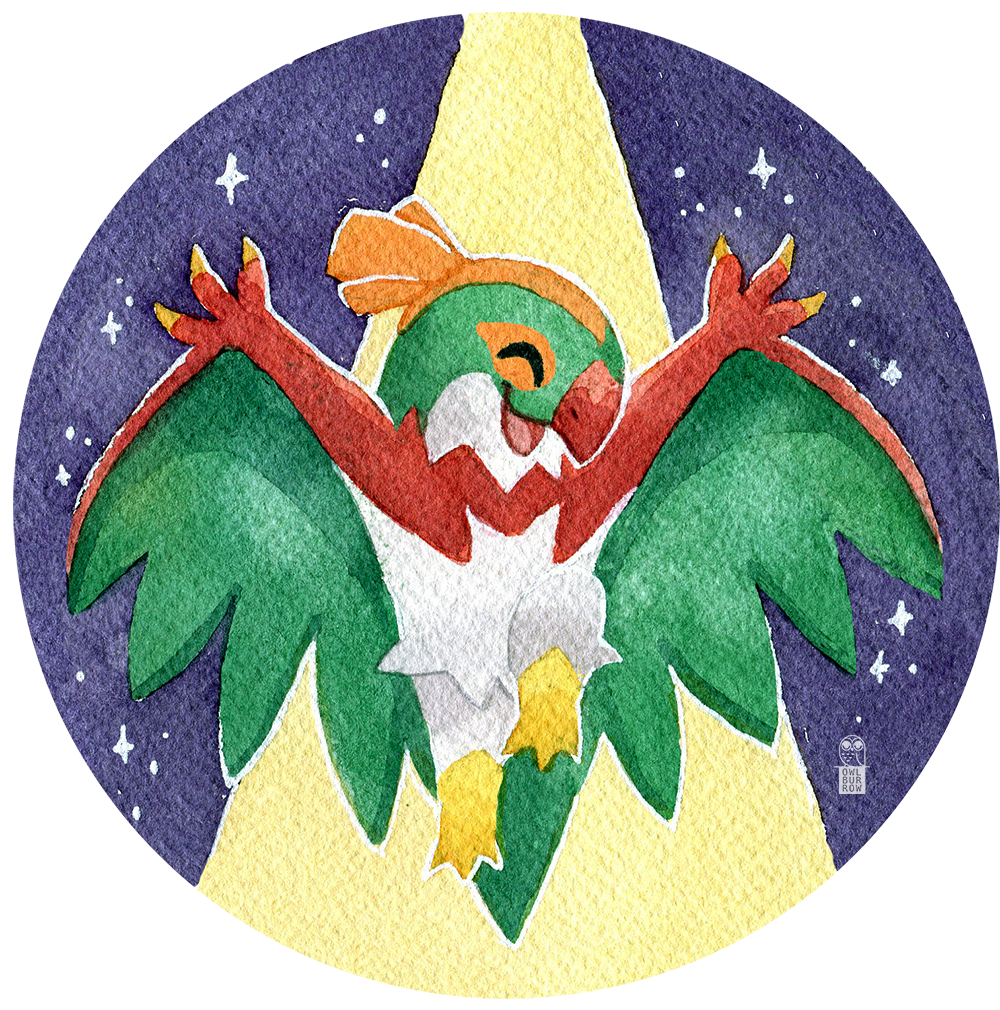 A big 2.5 inch button featuring watercolor artwork of Hawlucha under the spotlight! A pin on the back lets you show off your style on your backpack, jacket and more.
